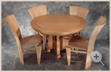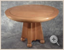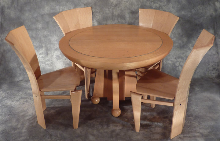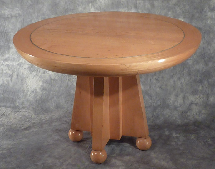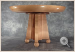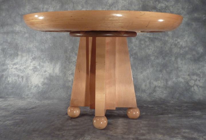 The outer ring of the table top is constructed of 32 layers of 1/8" straight grained maple which are laminated around a mold and turned to create a three inch radius around its edge. The center of the top is bird's eye maple and floats independently of the laminated ring which expands and contracts differently. The top rests on a solid maple and walnut base which floats on four solid maple spheres. The table can accommodate a 20" extension leaf.